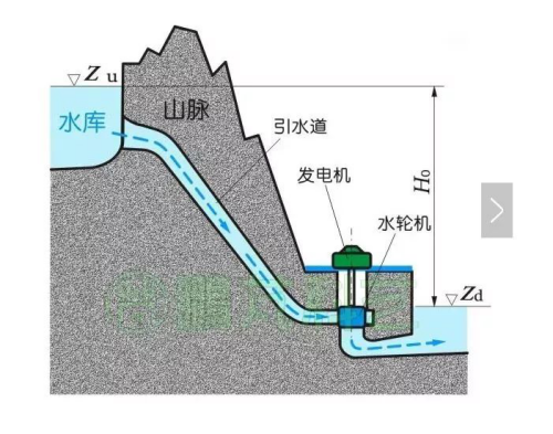 在河流高處建立水庫蓄水提高水位,在較低的下游安裝水輪機(jī),通過引水道把上游水庫的水引到下游低處的水輪機(jī),水流推動(dòng)水輪機(jī)旋轉(zhuǎn)帶動(dòng)發(fā)電機(jī)發(fā)電,然后通過尾水渠到下游河道,引水道會較長并穿過山體,這是一種引水發(fā)電的方式。